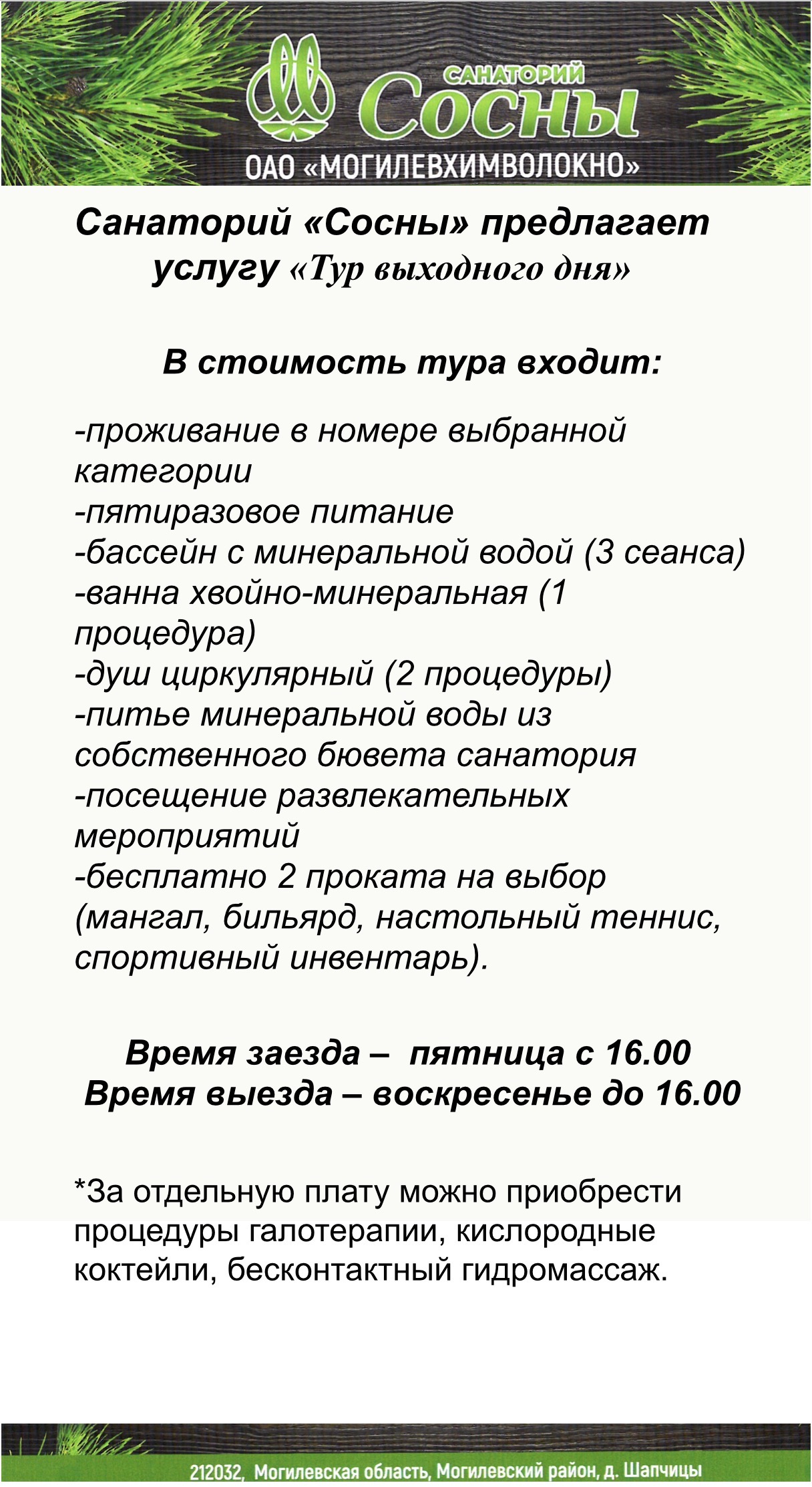 Путевка включает в себя: проживание в 2-х местных 2-х комнатных номерах (при необходимости возможно оформление дополнительного места); 5-ти разовое питание; посещение ванного и душевого отделения, 2 сеанса бассейна; бесплатный прокат бильярда (1 час); пользование площадкой для шашлыков (мангал, беседка).